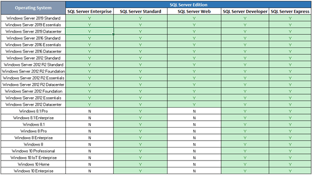 Below table shows SQL server edition and its corresponding supported Operating system. 'Y' means Supported and 'N' Means Not Supported.