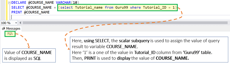 DECLARE @COURSE_NAME VARCHAR (10) SELECT @COURSE_NAME = (select Tutorial_name from gtupapers where Tutorial_ID = 1) PRINT @COURSE_NAME