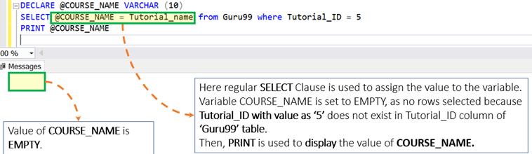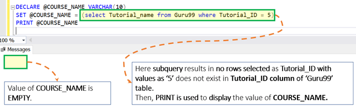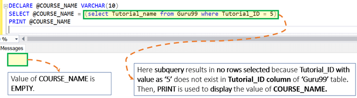 DECLARE @COURSE_NAME VARCHAR (10) SET @COURSE_NAME = (select Tutorial_name from gtupapers where Tutorial_ID = 5) PRINT @COURSE_NAME