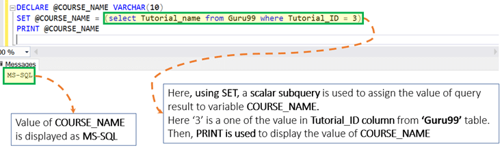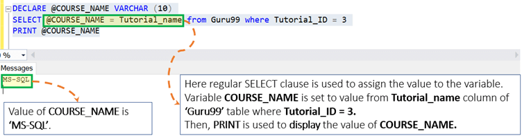 DECLARE @COURSE_NAME VARCHAR (10) SET @COURSE_NAME = (select Tutorial_name from gtupapers where Tutorial_ID = 3) PRINT @COURSE_NAME