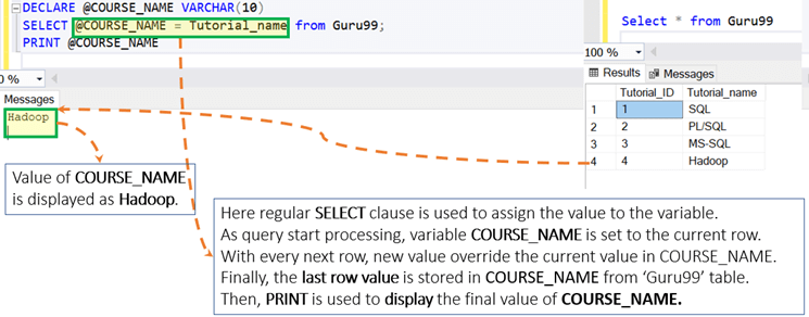 DECLARE @COURSE_NAME VARCHAR (10) SELECT @COURSE_NAME = Tutorial_name from gtupapers PRINT @COURSE_NAME