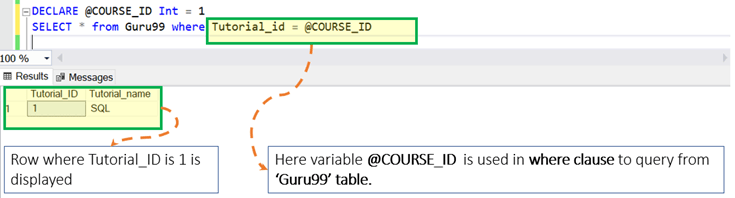 DECLARE @COURSE_ID INT SELECT @COURSE_ID = 5 PRINT @COURSE_ID