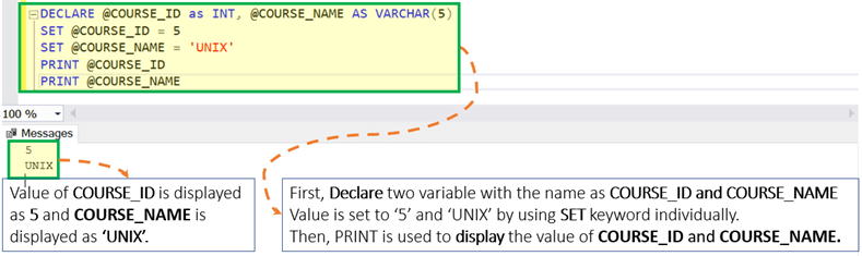 DECLARE @COURSE_ID as INT, @COURSE_NAME AS VARCHAR(5) SET @COURSE_ID = 5 SET @COURSE_NAME = 'UNIX' PRINT @COURSE_ID PRINT @COURSE_NAME