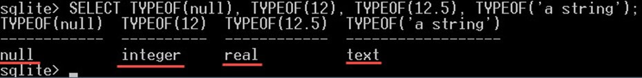SELECT TYPEOF(null), TYPEOF(12), TYPEOF(12.5), TYPEOF('a string');This will give you: