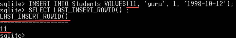 INSERT INTO Students VALUES(11, 'guru', 1, '1998-10-12'); SELECT LAST_INSERT_ROWID();