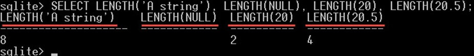 SELECT LENGTH('A string'), LENGTH(NULL), LENGTH(20), LENGTH(20.5);This will give you: