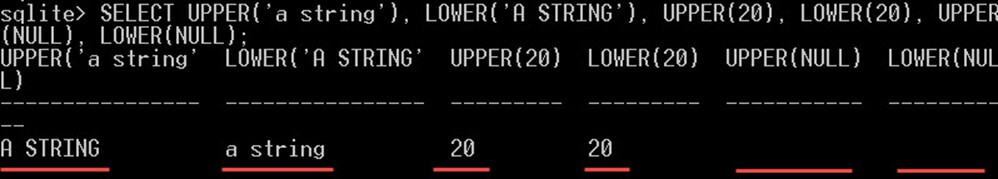 SELECT UPPER('a string'), LOWER('A STRING'), UPPER(20), LOWER(20), UPPER(NULL), LOWER(NULL);This will give you: