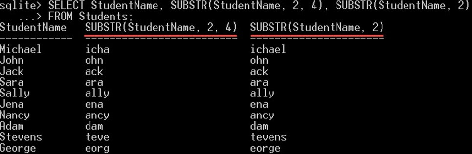 SELECT StudentName, SUBSTR(StudentName, 2, 4), SUBSTR(StudentName, 2) FROM Students;