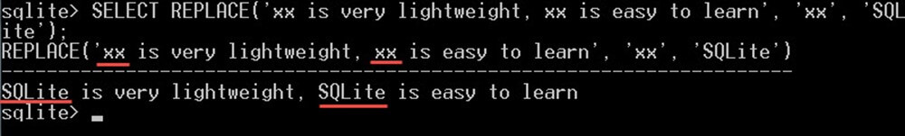 SELECT REPLACE('xx is very lightweight, xx is easy to learn', 'xx', 'SQLite');This will give you