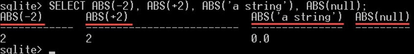 SELECT ABS(-2), ABS(+2), ABS('a string'), ABS(null);This will give you: