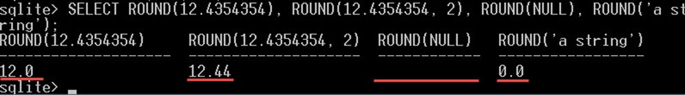 SELECT ROUND(12.4354354), ROUND(12.4354354, 2), ROUND(NULL), ROUND('a string');This will give you: