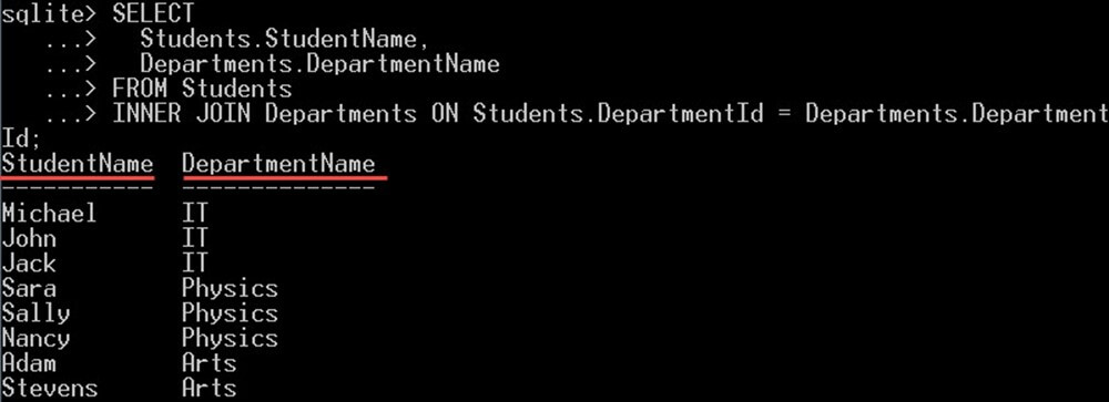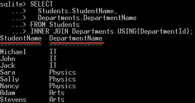 The INNER JOIN can be written using the "USING" clause to avoid redundancy, so instead of writing "ON Students.DepartmentId = Departments.DepartmentId", you can just write "USING(DepartmentID)".