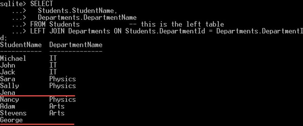 SELECT Students.StudentName, Departments.DepartmentName FROM Students -- this is the left table LEFT JOIN Departments ON Students.DepartmentId = Departments.DepartmentId;