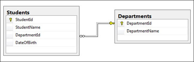CREATE TABLE [Departments] ( [DepartmentId] INTEGER NOT NULL PRIMARY KEY AUTOINCREMENT, [DepartmentName] NVARCHAR(50) NULL ); CREATE TABLE [Students] ( [StudentId] INTEGER PRIMARY KEY AUTOINCREMENT NOT NULL, [StudentName] NVARCHAR(50) NULL, [DepartmentId] INTEGER NOT NULL, [DateOfBirth] DATE NULL, FOREIGN KEY(DepartmentId) REFERENCES Departments(DepartmentId) );