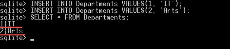 INSERT INTO Students(StudentName,DepartmentId) VALUES('John', 5);The row won't be inserted, and you will get an error saying that: FOREIGN KEY constraint failed.