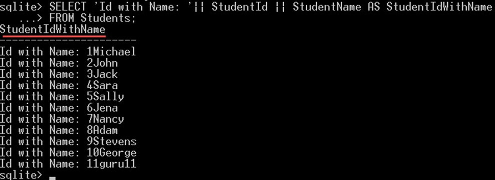 SELECT 'Id with Name: '|| StudentId || StudentName AS StudentIdWithName FROM Students;