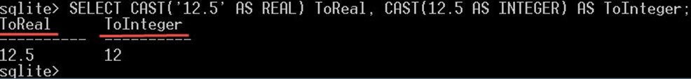 SELECT CAST('12.5' AS REAL) ToReal, CAST(12.5 AS INTEGER) AS ToInteger;This will give you: