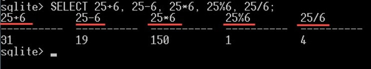 SELECT 25+6, 25-6, 25*6, 25%6, 25/6;