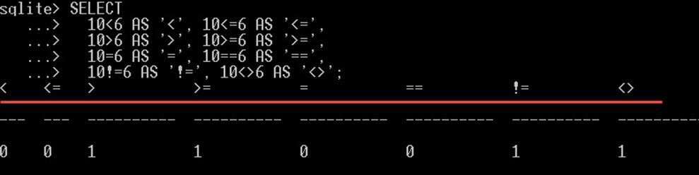 SELECT 10<6 AS '<', 10<=6 AS '<=', 10>6 AS '>', 10>=6 AS '>=', 10=6 AS '=', 10==6 AS '==', 10!=6 AS '!=', 10<>6 AS '<>';