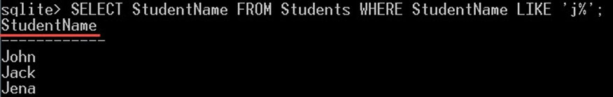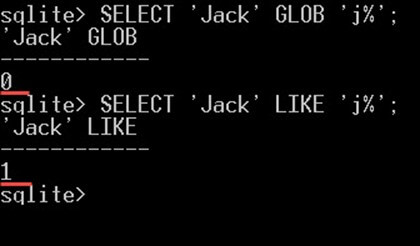 SELECT 'Jack' GLOB 'j%'; SELECT 'Jack' LIKE 'j%';