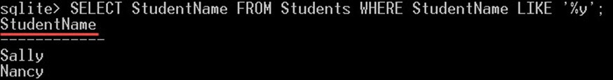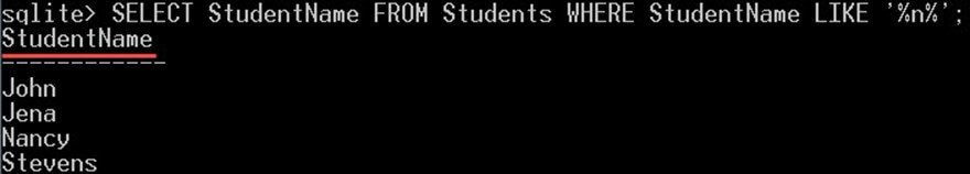"GLOB" – is equivalent to the LIKE operator, but GLOB is case sensitive, unlike LIKE operator. For example, the following two commands will return different results: