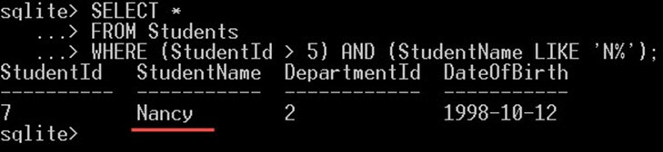 As an output, in the above screenshot, this will give you only "Nancy". Nancy is the only student that meets both conditions.