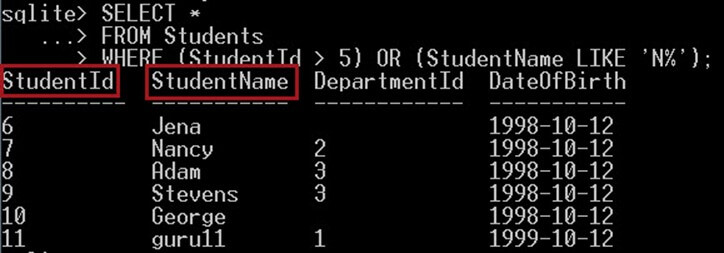 The following query will search for students that have StudentId > 5 or StudentName begins with the letter N, the returned students must meet at least one of the conditions: