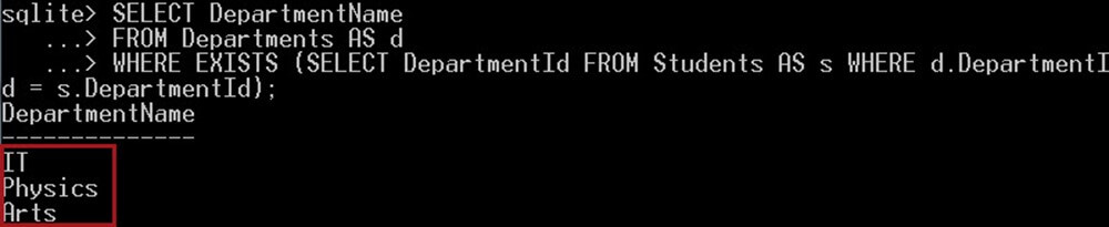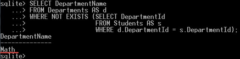 The above query is called a subquery here because it is nested in the WHERE clause. The subquery will return the DepartmentId values that will be used by the operator NOT EXISTS.