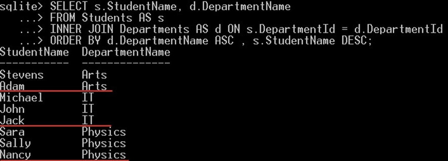 SELECT Students.StudentName, Departments.DepartmentName FROM Students INNER JOIN Departments ON Students.DepartmentId = Departments.DepartmentId;