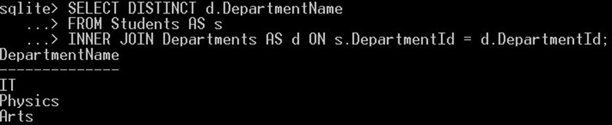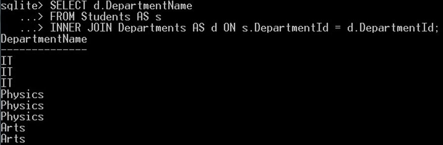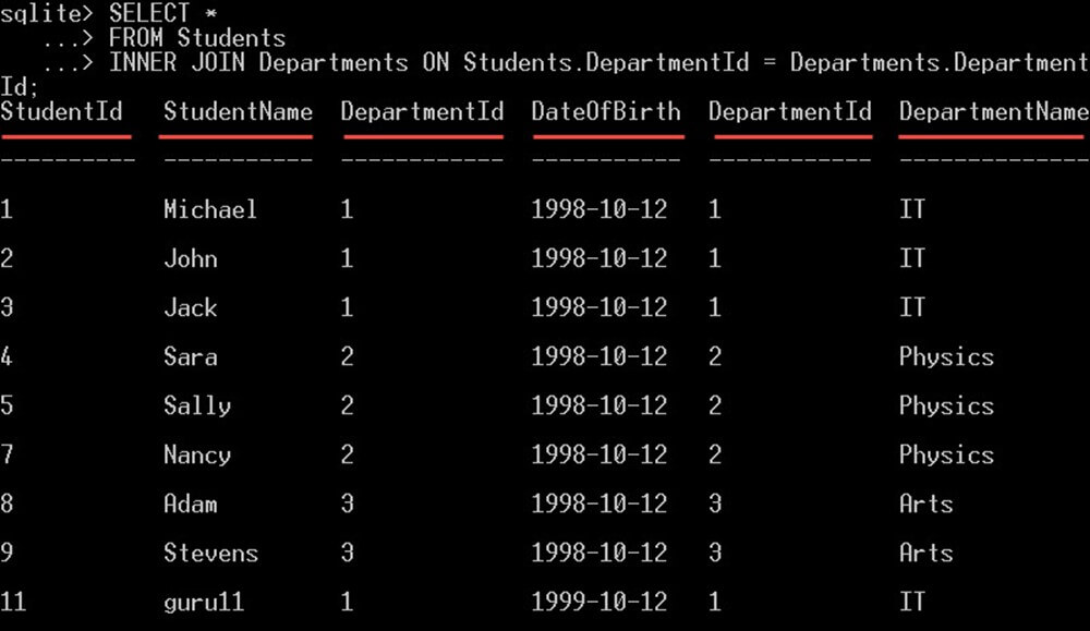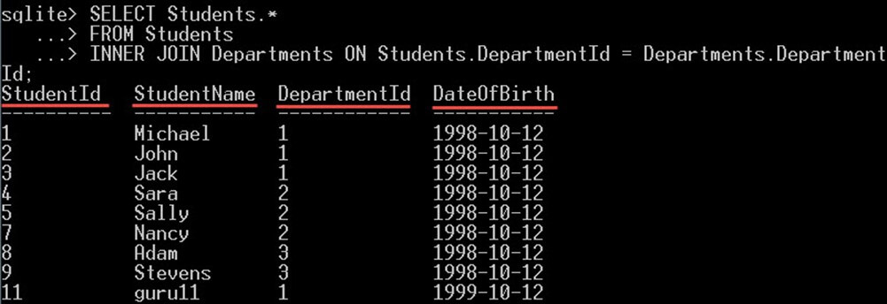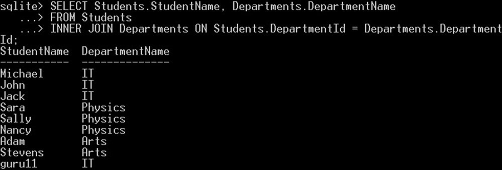 SELECT * FROM Students INNER JOIN Departments ON Students.DepartmentId = Departments.DepartmentId;