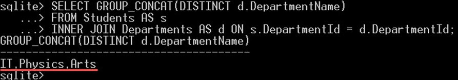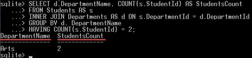 The clause HAVING COUNT(S.StudentId) = 2 will filter the groups returned and return only those groups that contain exactly two students on it. In our case, the Arts department has 2 students, so it is displayed in the output.