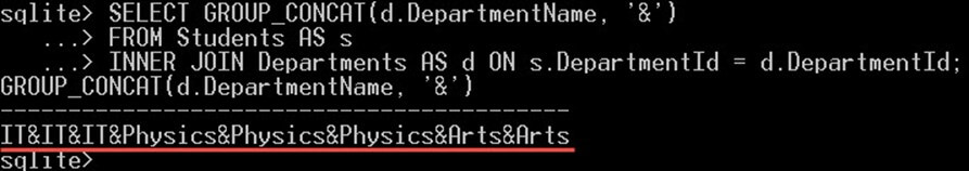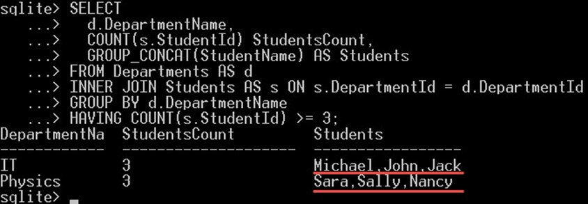 SELECT d.DepartmentName, COUNT(s.StudentId) StudentsCount, GROUP_CONCAT(StudentName) AS Students FROM Departments AS d INNER JOIN Students AS s ON s.DepartmentId = d.DepartmentId GROUP BY d.DepartmentName HAVING COUNT(s.StudentId) >= 3;
