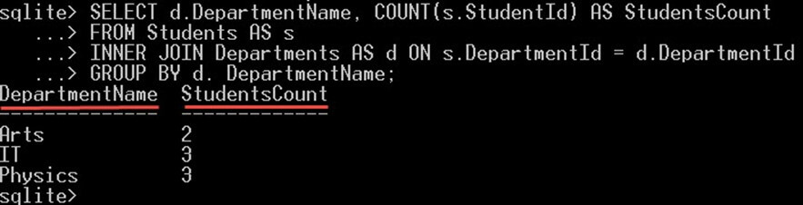SELECT d.DepartmentName, COUNT(s.StudentId) AS StudentsCount FROM Students AS s INNER JOIN Departments AS d ON s.DepartmentId = d.DepartmentId GROUP BY d. DepartmentName HAVING COUNT(s.StudentId) = 2;