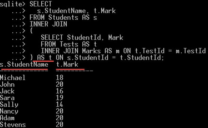 SELECT s.StudentName, t.Mark FROM Students AS s INNER JOIN ( SELECT StudentId, Mark FROM Tests AS t INNER JOIN Marks AS m ON t.TestId = m.TestId ) ON s.StudentId = t.StudentId;