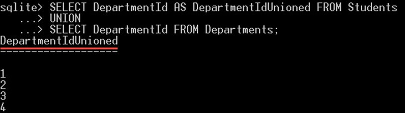 In the following example, we will get the list of DepartmentId from the students table and the list of the DepartmentId from the departments table in the same column: