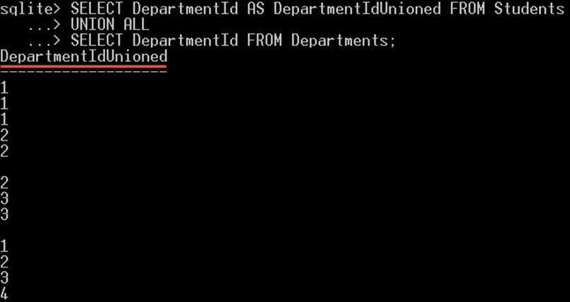 SELECT DepartmentId AS DepartmentIdUnioned FROM Students UNION ALL SELECT DepartmentId FROM Departments;