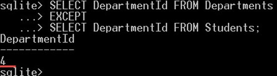 In the following query, we will select the DepartmentId values that exist in the departments table and doesn't exist in the students table: