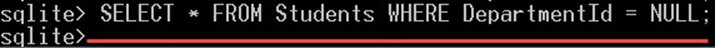 You can't use the normal equality operator (=) to search the null values. For example, the following query searches for the students that have a null DepartmentId value: