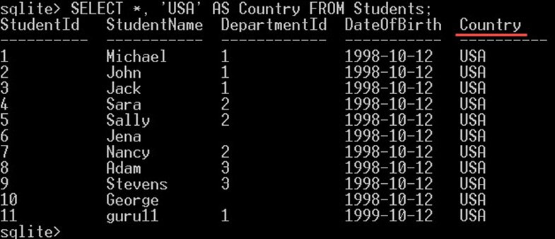 SELECT *, 'USA' AS Country FROM Students;