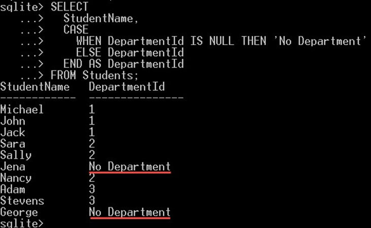 In the following example, we will use the CASE expression with NULL value in the department Id column in the Students table to display the text 'No Department' as following:
