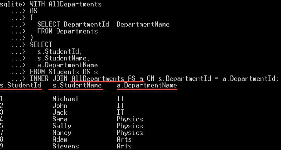 WITH AllDepartments AS ( SELECT DepartmentId, DepartmentName FROM Departments ) SELECT s.StudentId, s.StudentName, a.DepartmentName FROM Students AS s INNER JOIN AllDepartments AS a ON s.DepartmentId = a.DepartmentId;