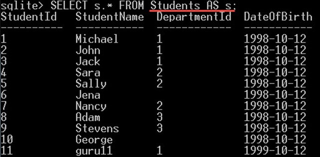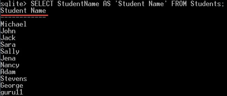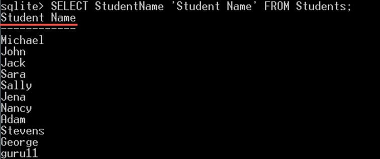 For example, if you want to select the StudentName column to be returned with "Student Name" instead of "StudentName" you can give it an alias like this: