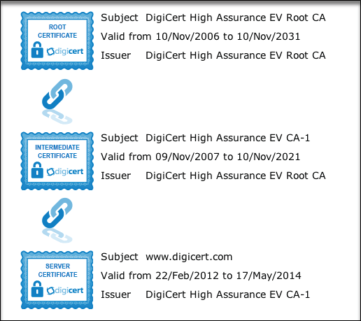 Browser and the server use SSL Certificate mechanism to be able to establish a secure connection. This connection involves verification of three types of certificates.