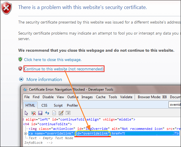 Observe SSL certificate error in IE browser you will find "Continue to this website (not recommended)" link.This link has ID "override link".You can view the ID in HTML mode using F12.