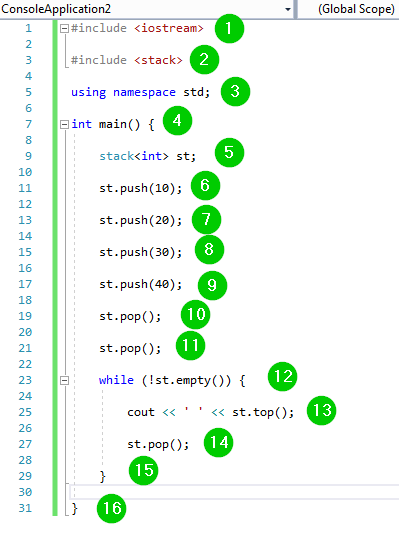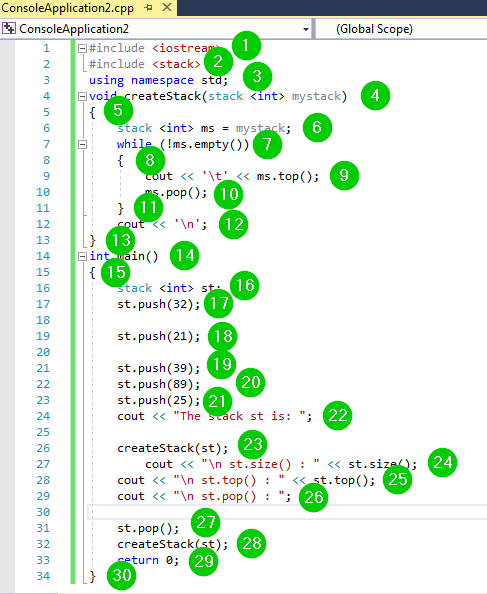 The STL (Standard Template Library) comes with template classes that provide common C++ data structures. Therefore, a stack can also be implemented in STL. We simply include this library in our code and use it to define a stack.