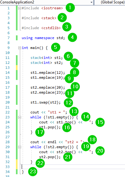 - Use the emplace() function to insert the integer 23 into the stack named st2.