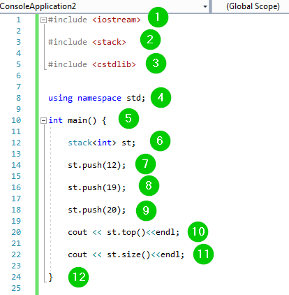 - Use the emplace() function to insert the integer 12 into the stack named st1.