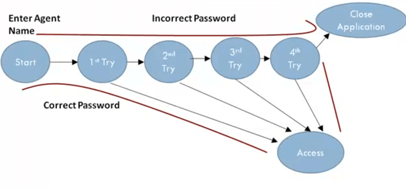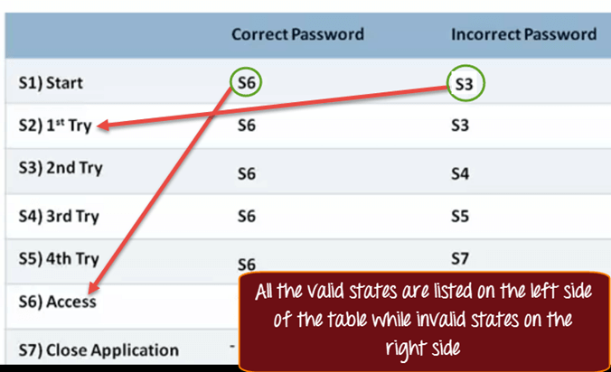 For example, while in S1 state you enter a correct password you are taken to state S6 (Access Granted). Suppose if you have entered the wrong password at first attempt you will be taken to state S3 or 2nd Try.