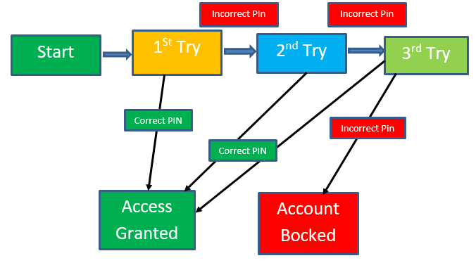 In the diagram whenever the user enters the correct PIN he is moved to Access granted state, and if he enters the wrong password he is moved to next try and if he does the same for the 3rd time the account blocked state is reached.