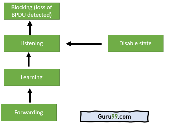| Listening | Computation of loop-free topology is carried out in this STP state. The port is assigned its role. | Yes (Send and received BPDUS) | NO |